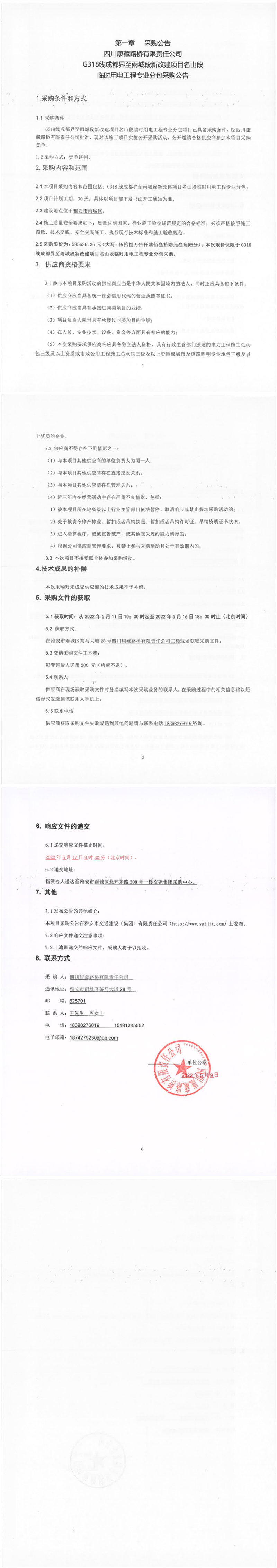 四川康藏路桥有限责任公司G318线成都界至雨城段新改建项目名山段临时用电工程专业分包采购公告