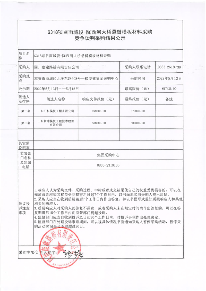 四川康藏路桥有限责任公司G318项目雨城段-陇西河大桥悬臂模板材料采购竞争谈判采购结果公示