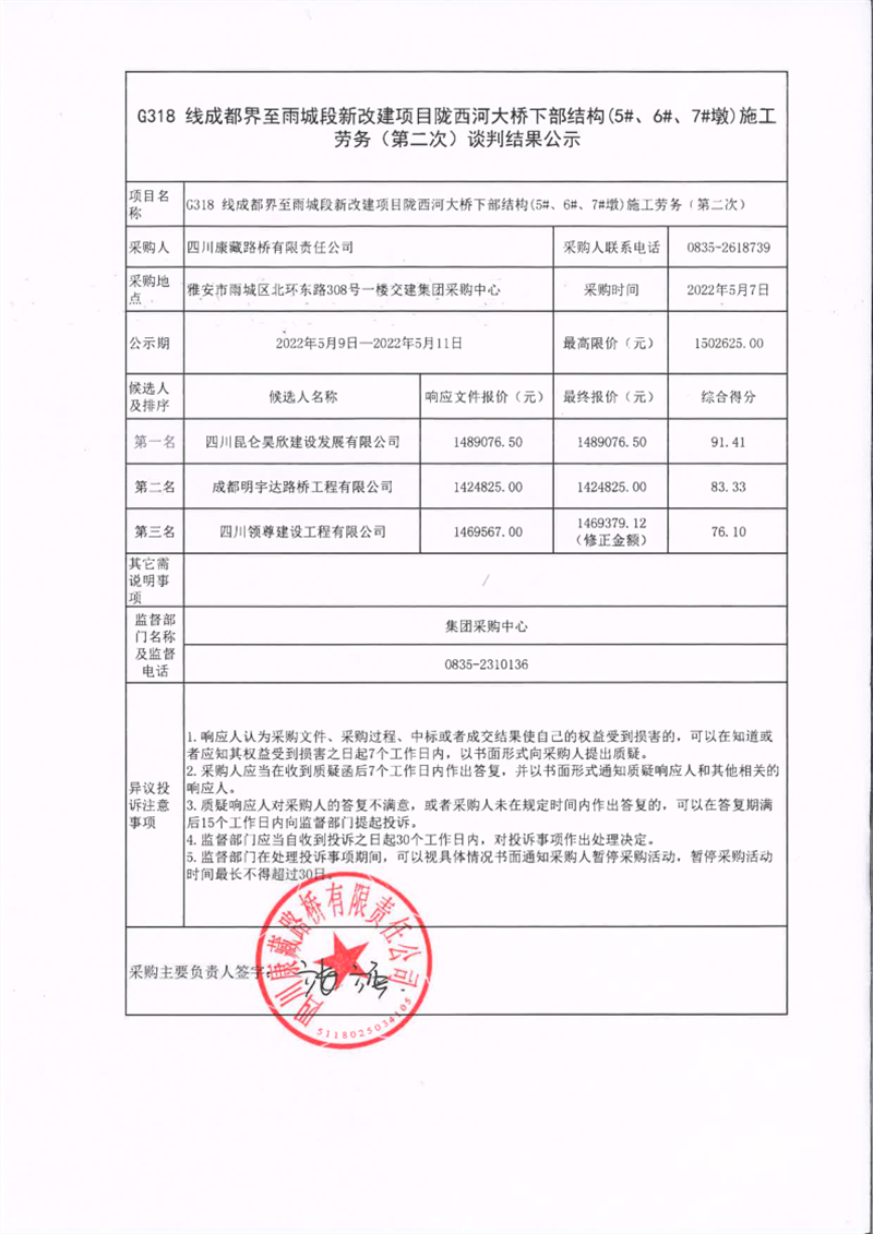 四川康藏路桥有限责任公司G318线成都界至雨城段新改建项目陇西河大桥下部结构(5#、6#、7#墩)施工劳务(第二次)谈判结果公示