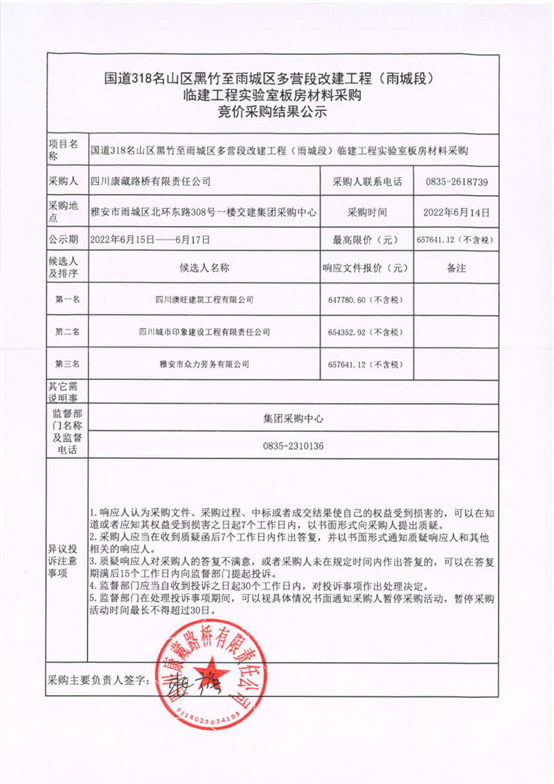 四川康藏路桥有限责任公司国道318名山区黑竹至雨城区多营段改建工程(雨城段)临建工程实验室板房材料采购竞价采购结果公示