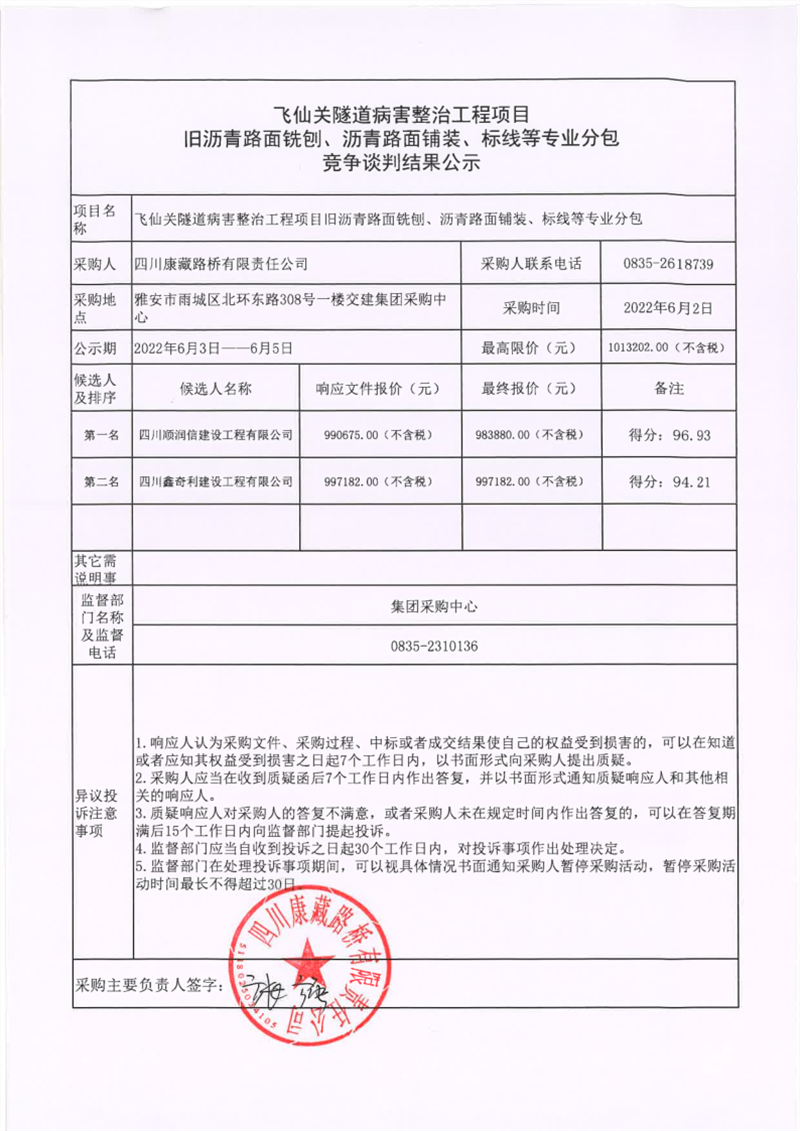 四川康藏路桥有限责任公司飞仙关隧道病害整治工程项目旧沥青路面铣刨、沥青路面铺装、标线等专业分包竞争谈判结果公示
