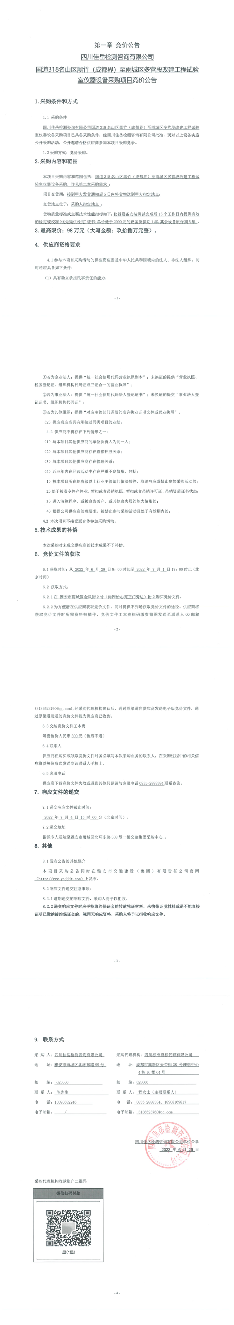 四川佳岳检测咨询有限公司国道318名山区黑竹(成都界)至雨城区多营段改建工程试验室仪器设备采购项目竞价公告
