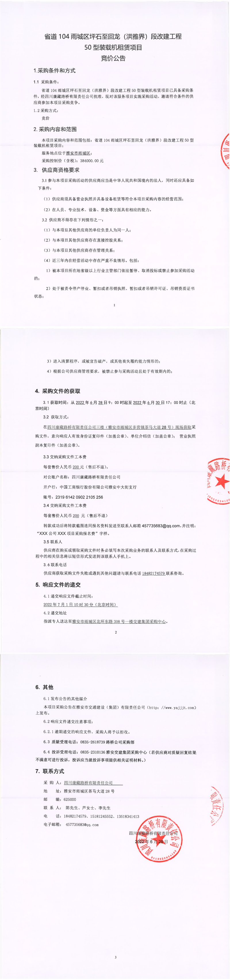 四川康藏路桥有限责任公司省道104雨城区坪石至回龙(洪雅界)段改建工程50型装载机租赁项目竞价公告