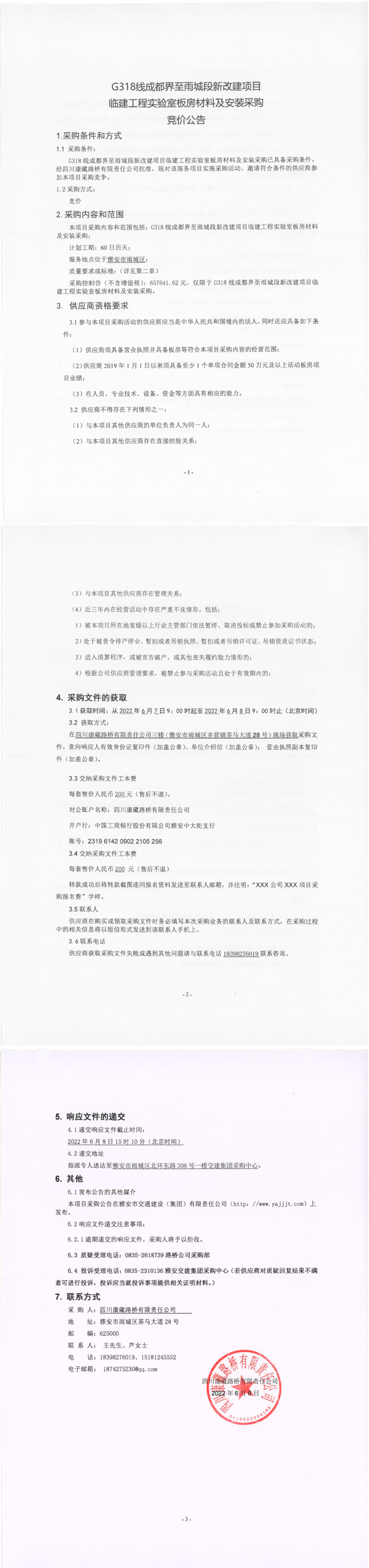 四川康藏路桥有限责任公司G318线成都界至雨城段新改建项目临建工程实验室板房材料及安装采购竞价公告