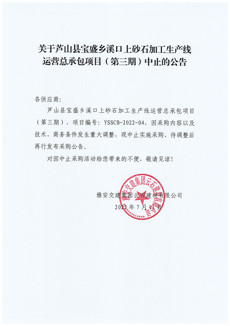 大红鹰dhy(中国)集团云石建材有限公司关于芦山县宝盛乡溪口上砂石加工生产线运营总承包项目(第三期)中止的公告