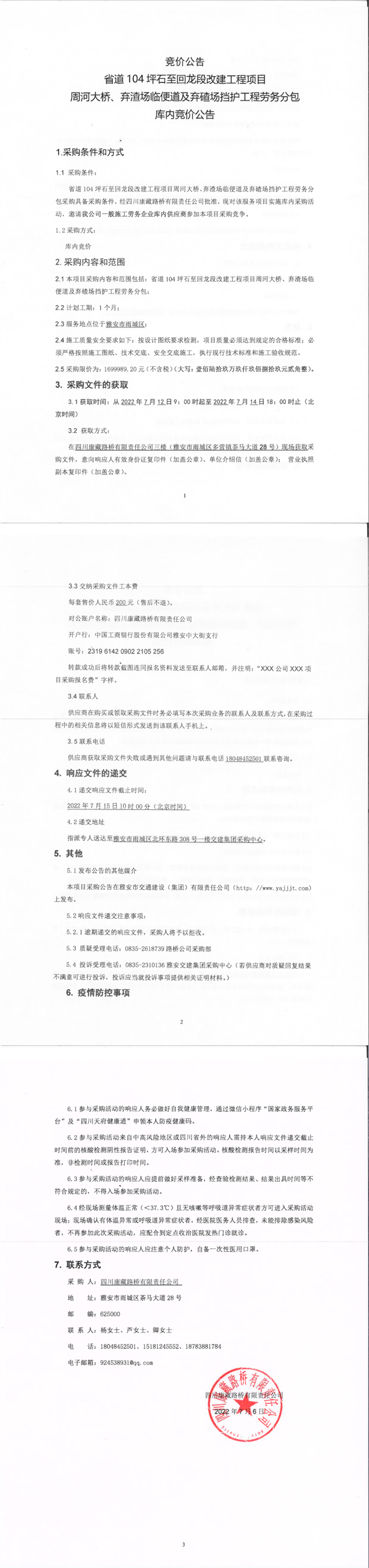 四川康藏路桥有限责任公司省道104坪石至回龙段改建工程项目周河大桥、弃渣场临便道及弃碴场挡护工程劳务分包库内竞价公告
