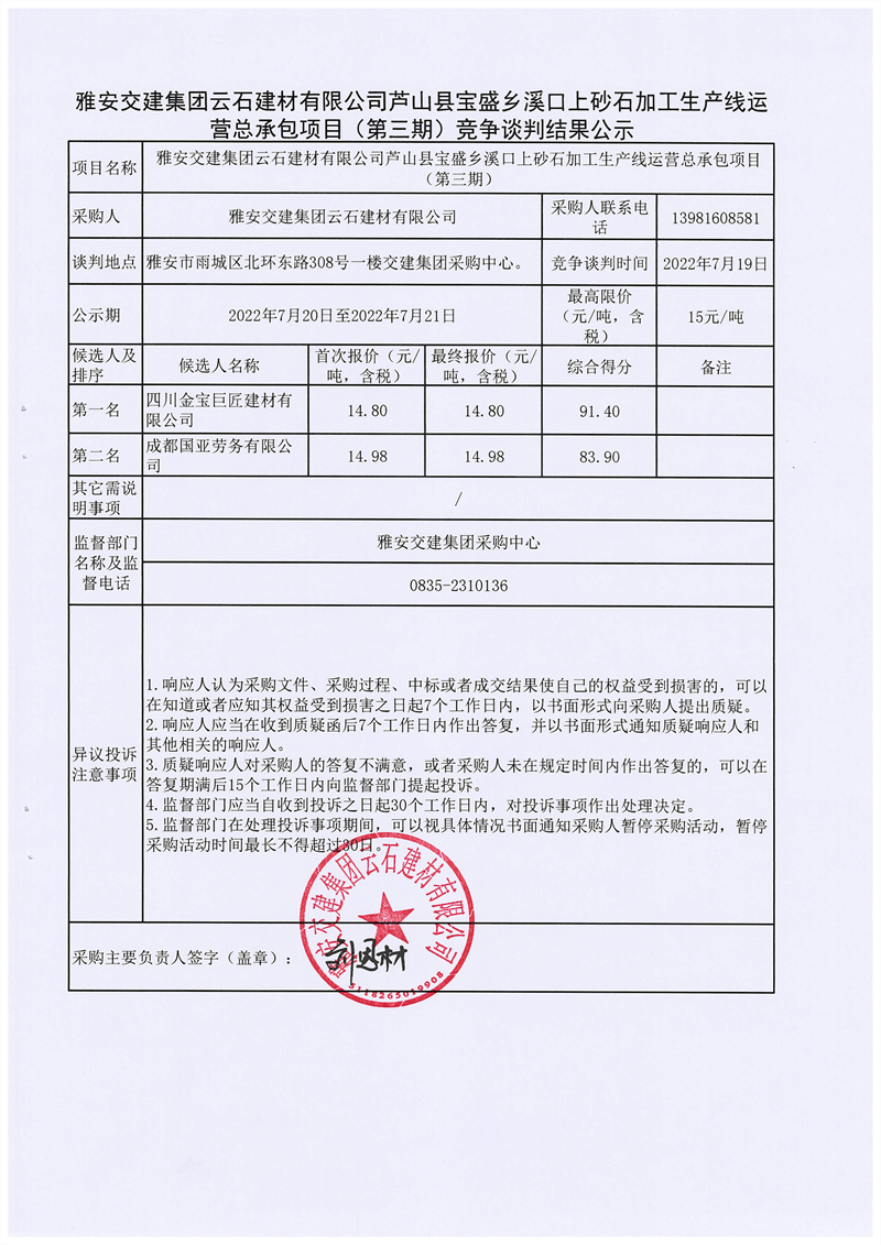 大红鹰dhy(中国)集团云石建材有限公司芦山县宝盛乡溪口上砂石加工生产线运营总承包项目(第三期)竞争谈判结果公示