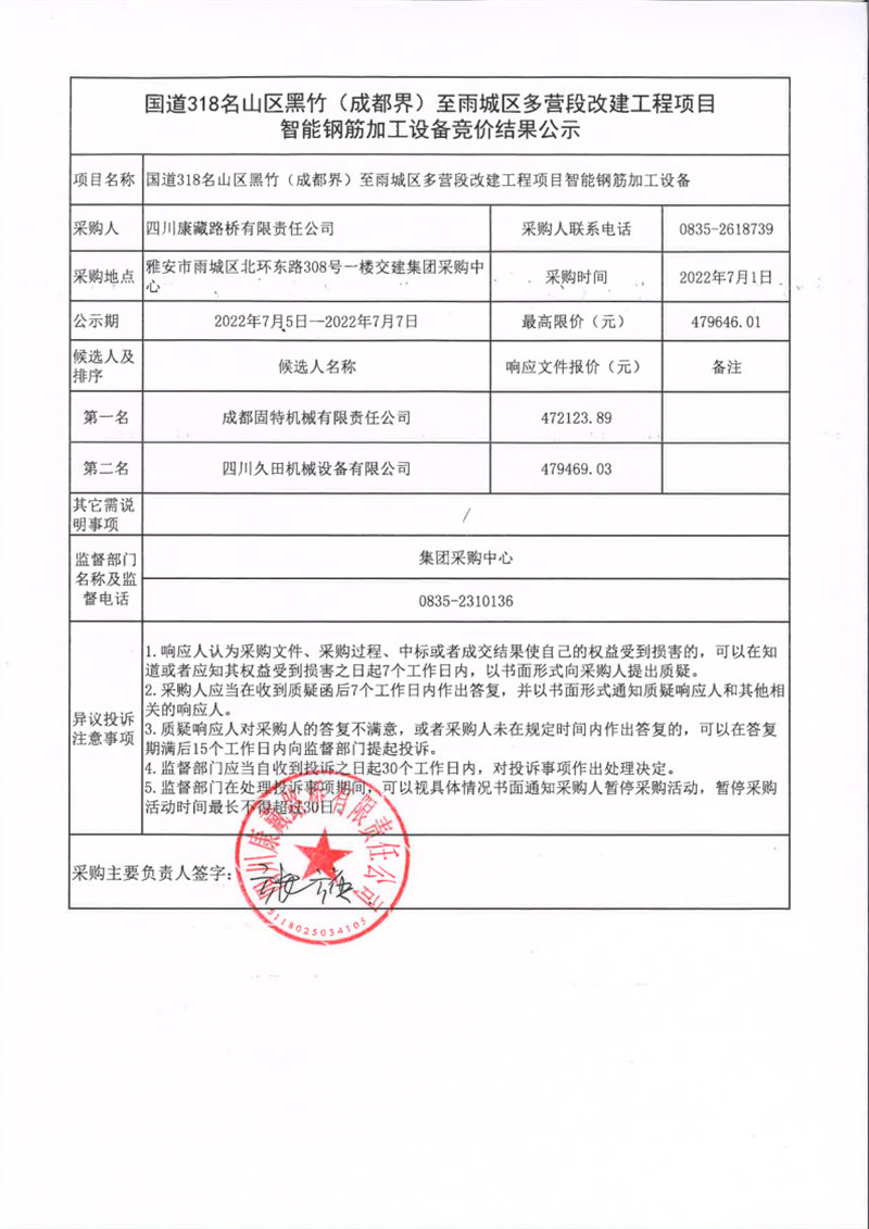 四川康藏路桥有限责任公司国道318名山区黑竹(成都界)至雨城区多营段改建工程智能钢筋加工设备竞价结果公示
