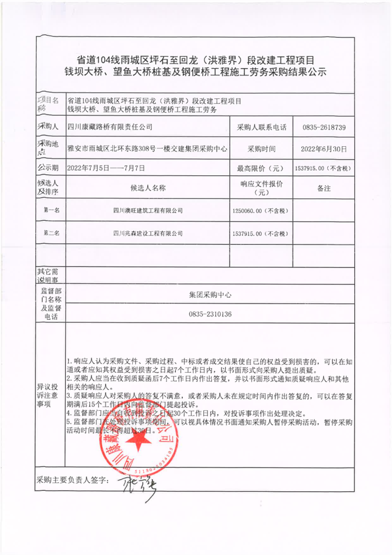 四川康藏路桥有限责任公司省道104线雨城区坪石至回龙(洪雅界)段改建工程项目钱坝大桥、望鱼大桥桩基及钢便桥工程施工劳务采购结果公示