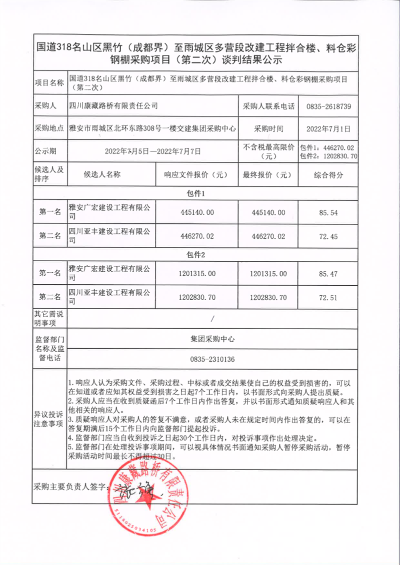 四川康藏路桥有限责任公司国道318名山区黑竹(成都界)至雨城区多营段改建工程拌合楼、料仓彩钢棚采购项目(第二次)谈判结果公示