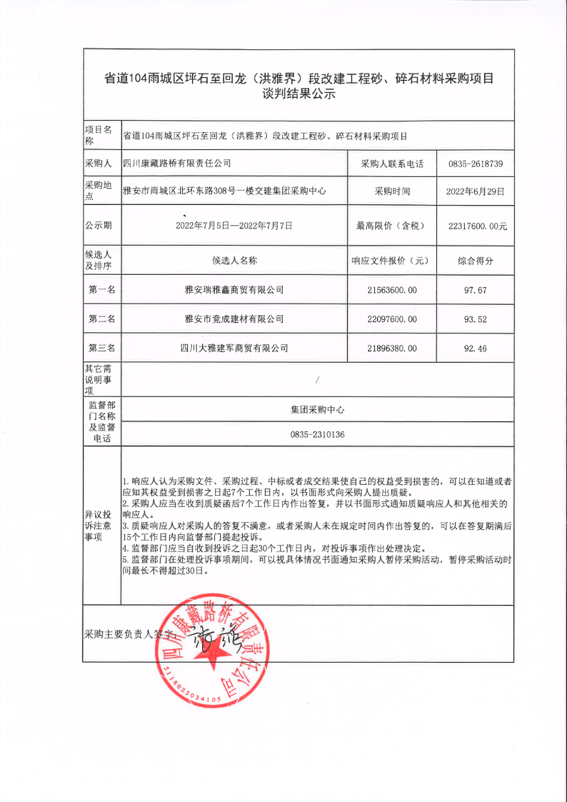 四川康藏路桥有限责任公司省道104雨城区坪石至回龙(洪雅界)段改建工程砂、碎石材料采购项目谈判结果公示