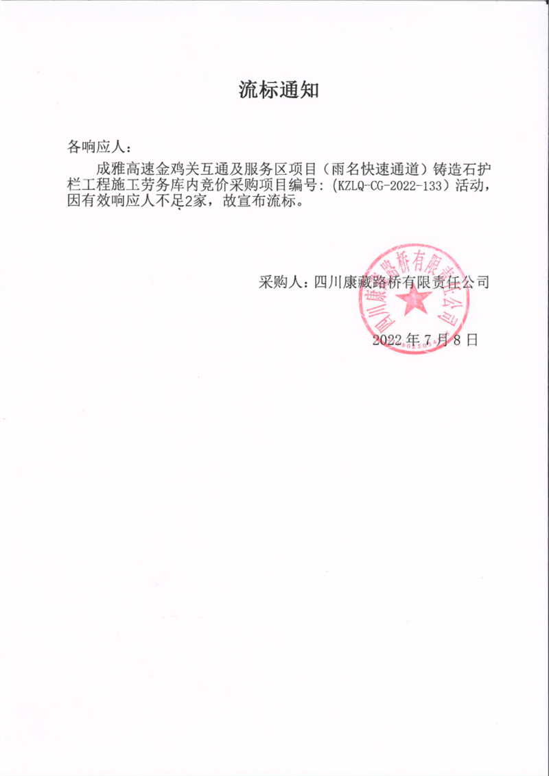 四川康藏路桥有限责任公司成雅高速金鸡关互通及服务区项目(雨名快速通道)铸造石护栏施工劳务库内竞价采购项目流标通知