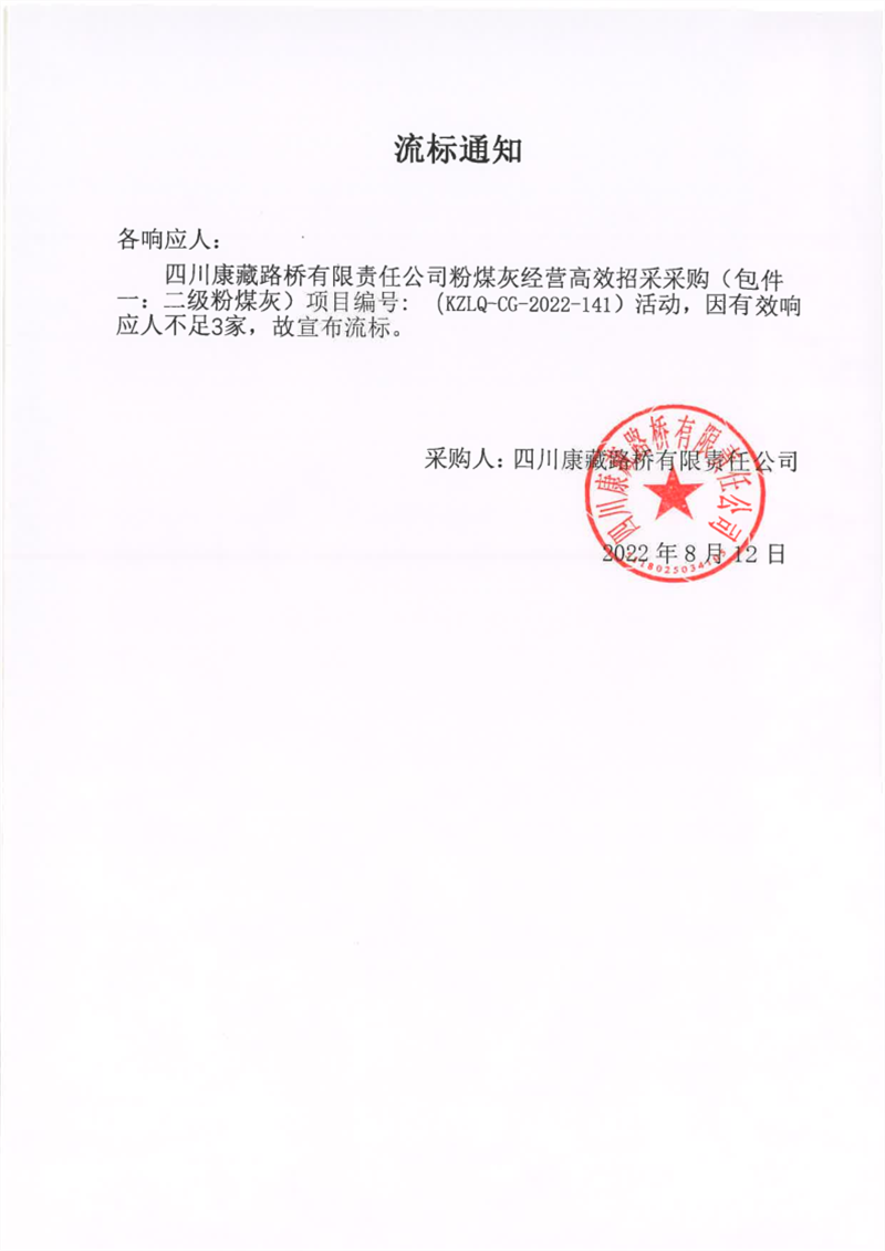 四川康藏路桥有限责任公司粉煤灰经营高效招采采购(包件一:二级粉煤灰)流标通知