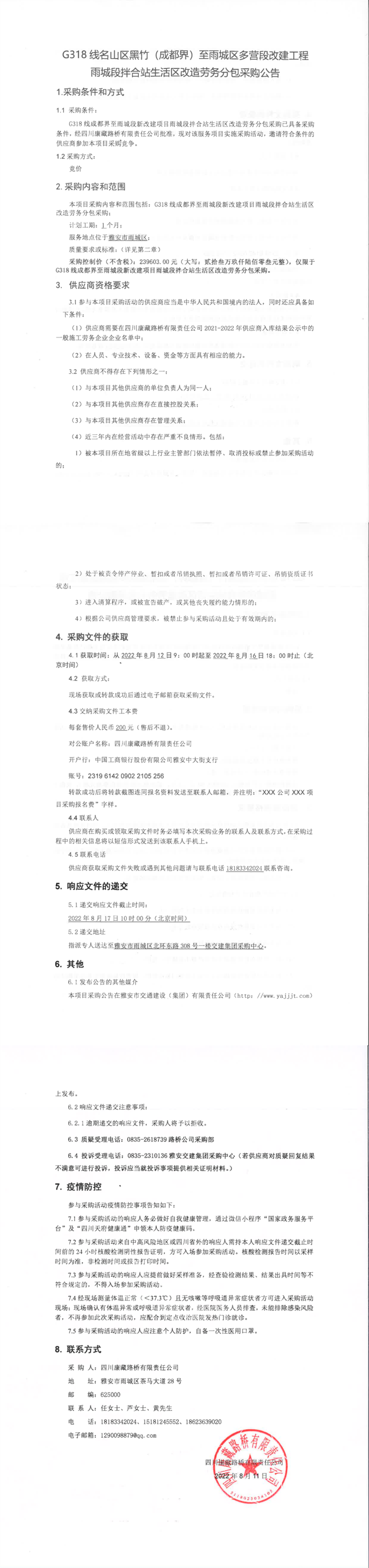 四川康藏路桥有限责任公司G318线名山区黑竹(成都界)至雨城区多营段改建工程雨城段拌合站生活区改造劳务分包采购公告