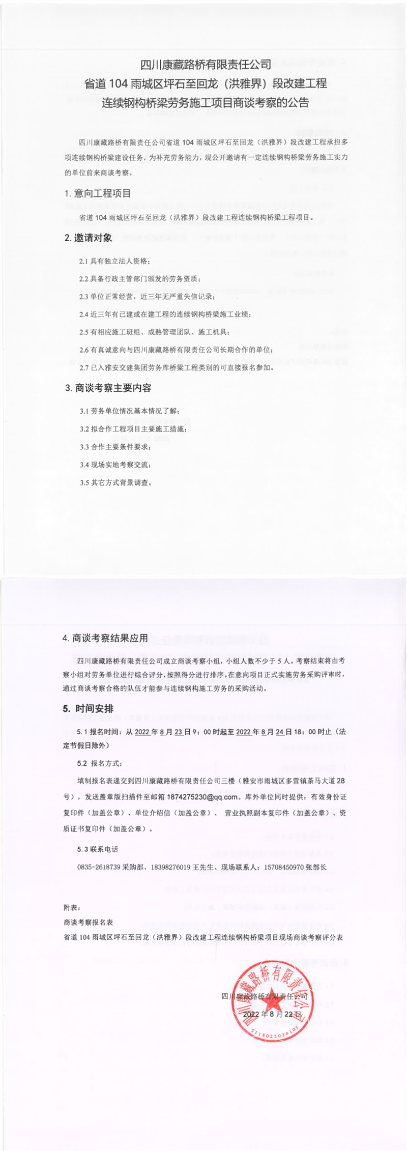 四川康藏路桥有限责任公司省道104雨城区坪石至回龙(洪雅界)段改建工程陆续在钢构桥梁劳务施工项目商谈考察的公告