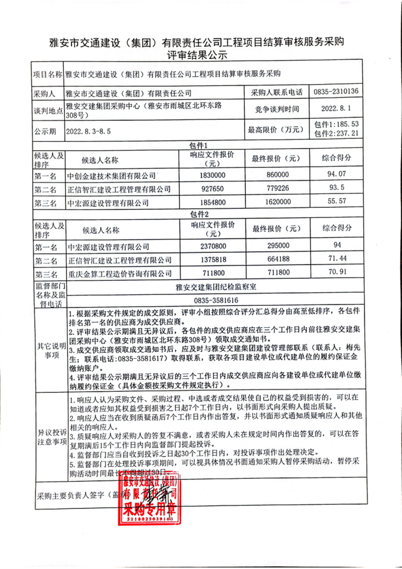 雅安市交通建设(集团)有限责任公司工程项目结算审核服务采购评审结果公示