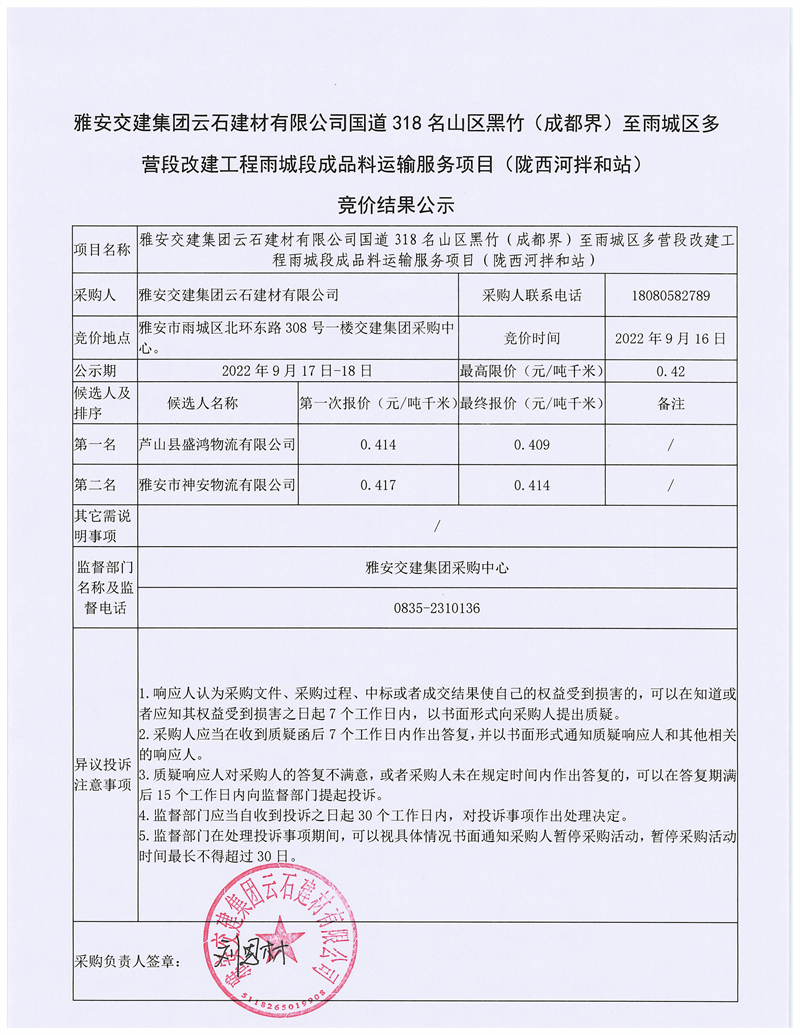 大红鹰dhy(中国)集团云石建材有限公司国道318名山区黑竹(成都界)至雨城区多营段改建工程雨城段成品料运输服务项目(陇西河拌和站)竞价结果公示