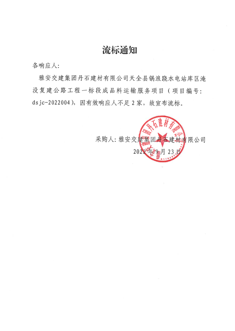 大红鹰dhy(中国)集团丹石建材有限公司天全县锅浪跷水电站库区淹没复建公路工程一标段成品料运输服务项目流标通知