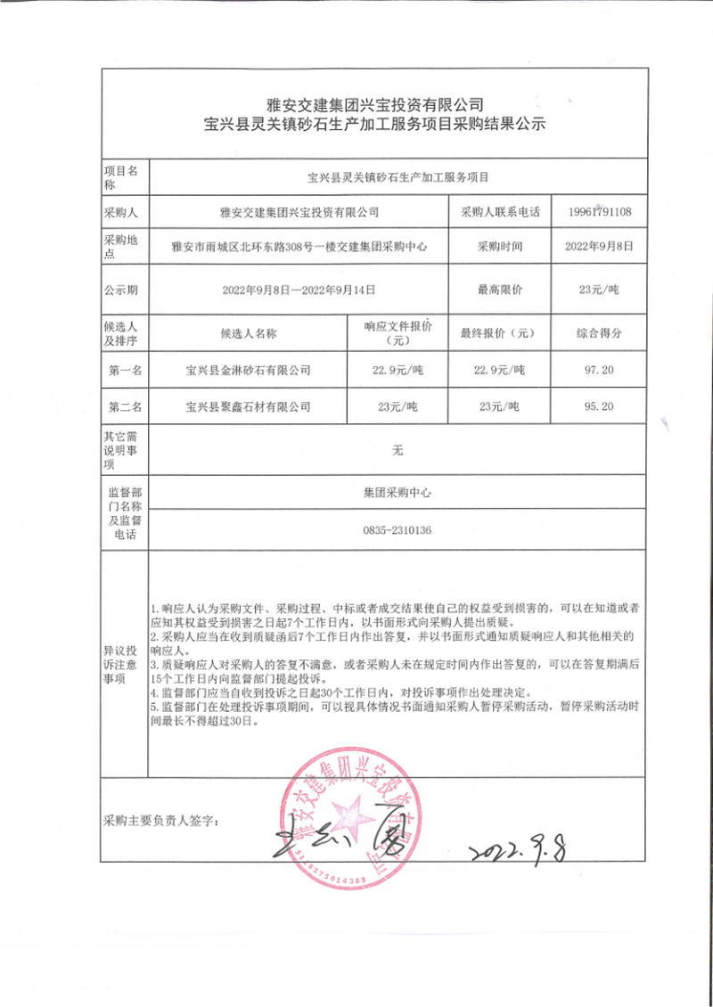 大红鹰dhy(中国)集团兴宝投资有限公司宝兴县灵关镇砂石生产加工服务项目采购结果公示