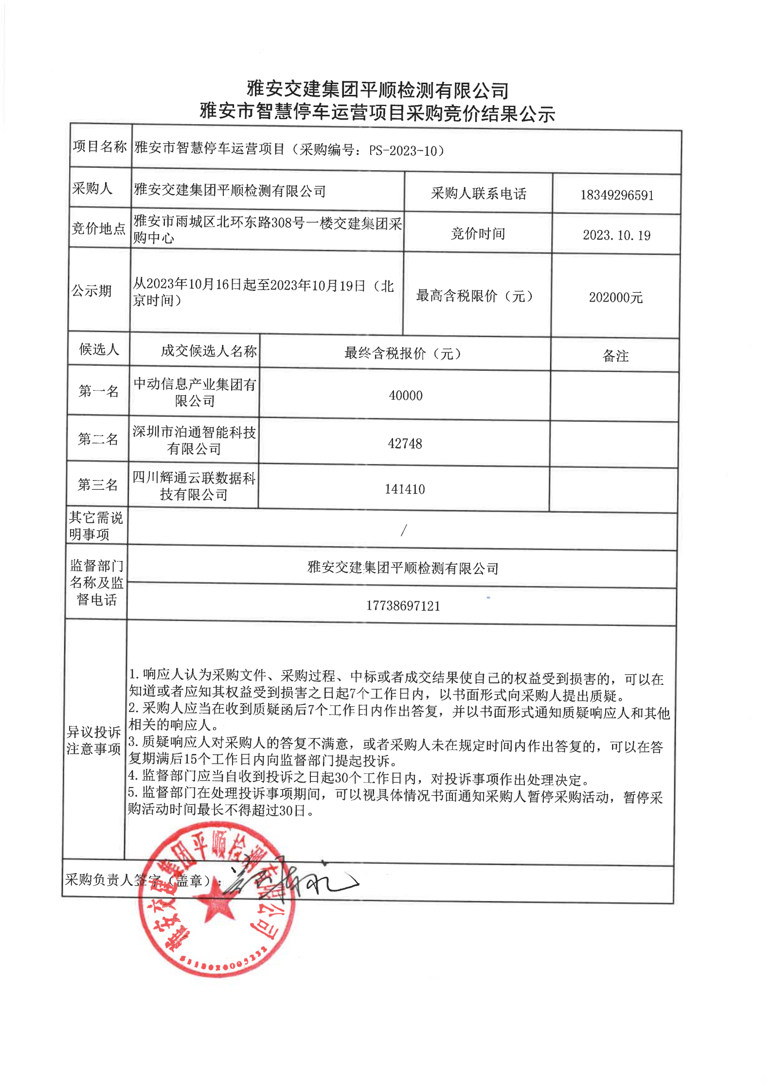 大红鹰dhy(中国)集团平顺检测有限公司雅安市智慧停车运营项目采购竞价结果公示