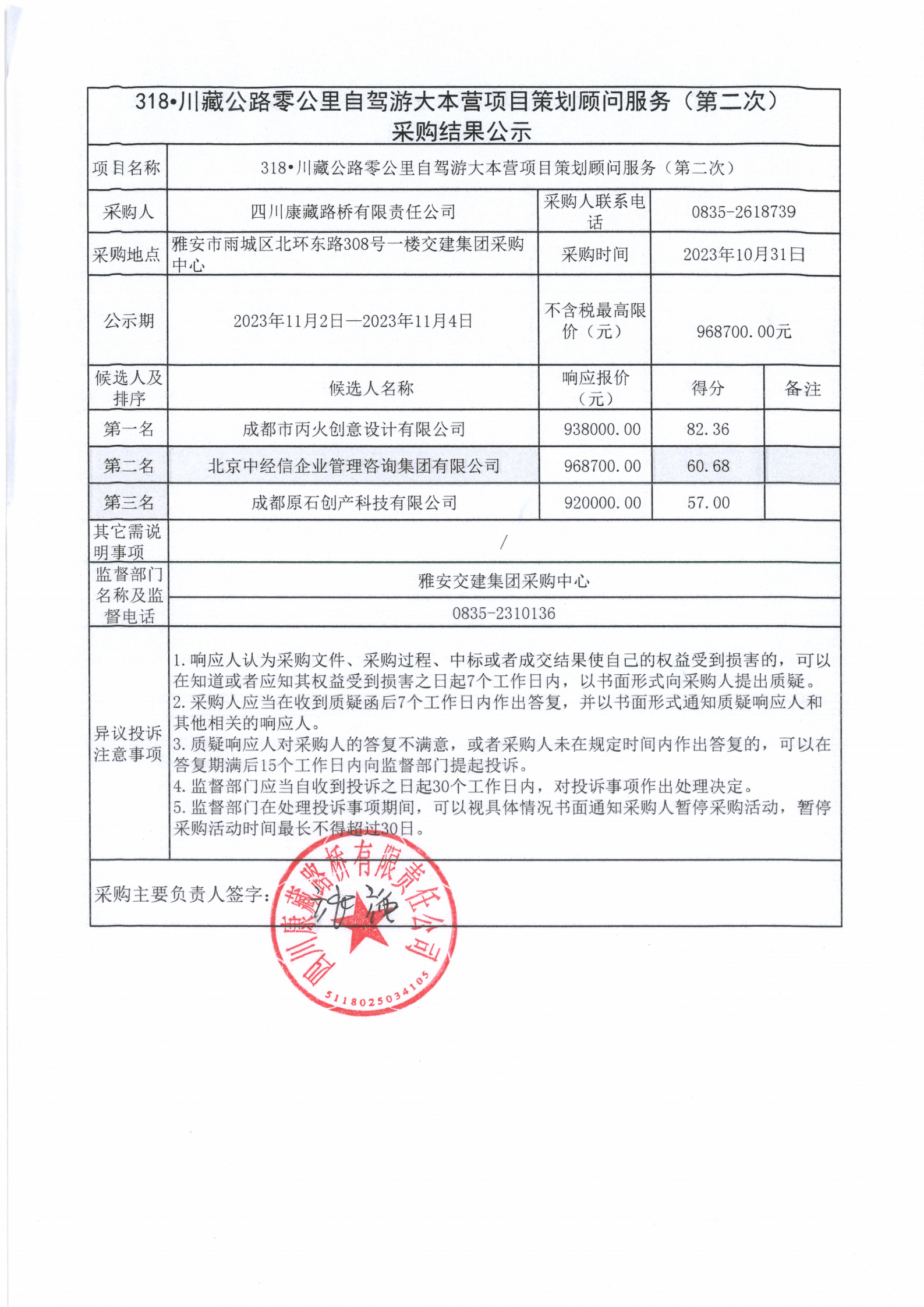 四川康藏路桥有限责任公司 318•川藏公路零公里自驾游大本营项目策划顾问服务(第二次)采购结果公示