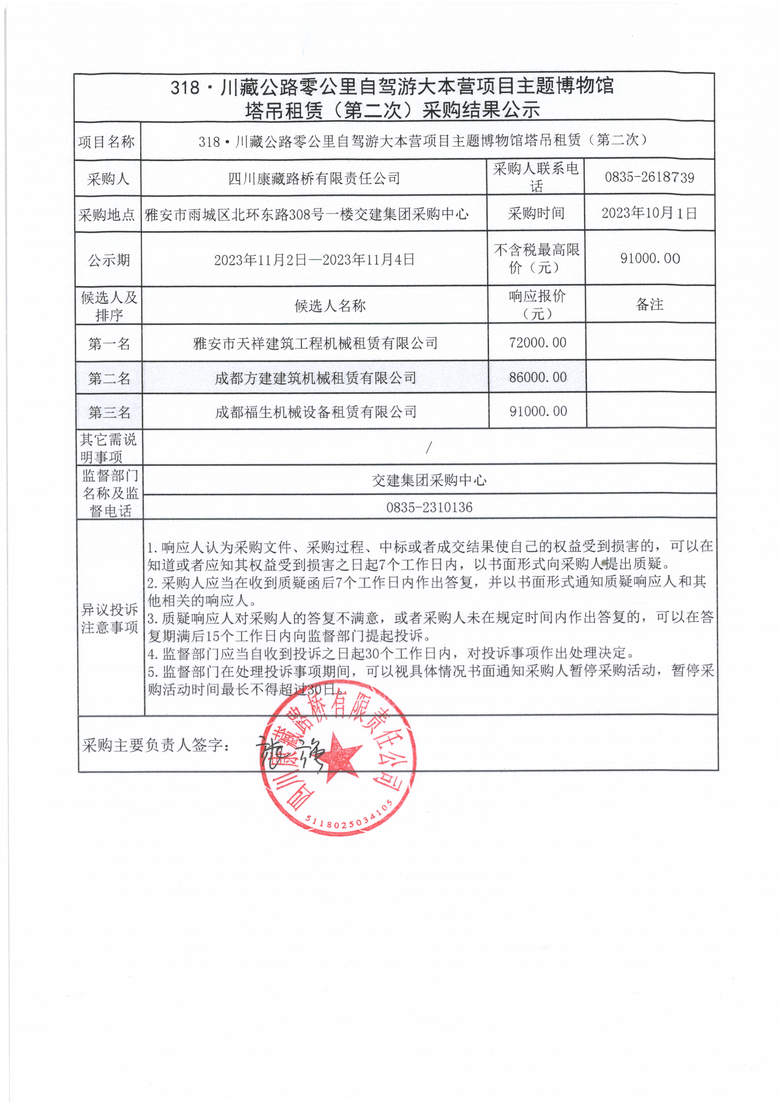 四川康藏路桥有限责任公司318·川藏公路零公里自驾游大本营项目主题博物馆塔吊租赁(第二次)采购结果公示