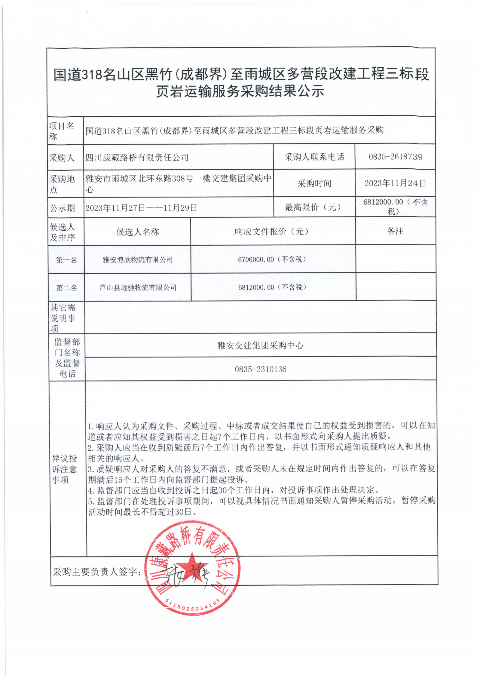 四川康藏路桥有限责任公司国道318名山区黑竹(成都界)至雨城区多营段改建工程三标段页岩运输服务采购结果公示