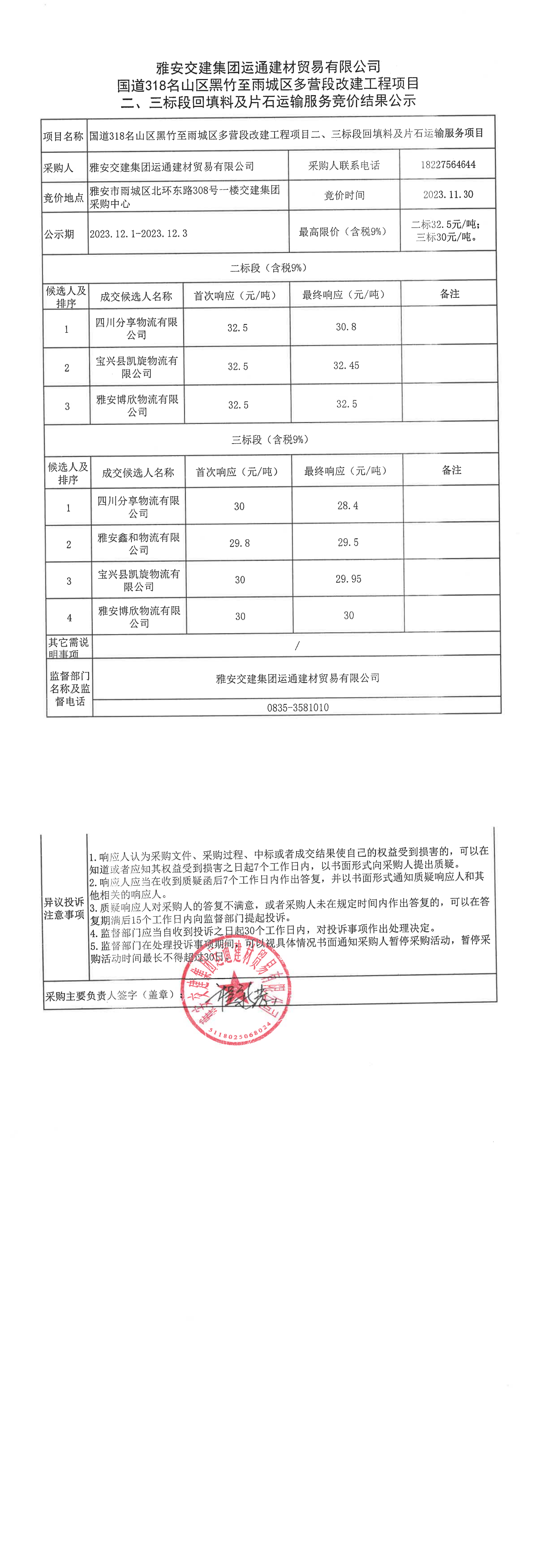 大红鹰dhy(中国)集团运通建材贸易有限公司国道318名山区黑竹至雨城区多营段改建工程项目二、三标段回填料、片石运输服务竞价结果公示