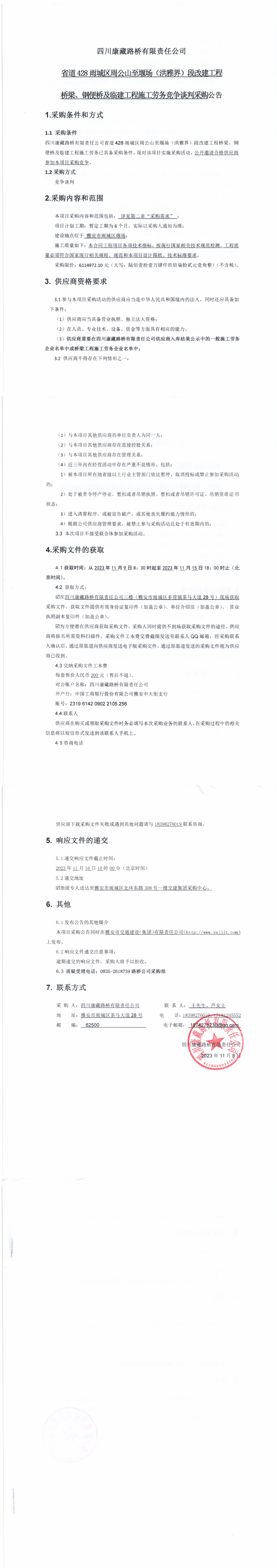 四川康藏路桥有限责任公司省道428雨城区周公山至堰场(洪雅界)段改建工程桥梁、钢便桥及临建工程施工劳务采购公告