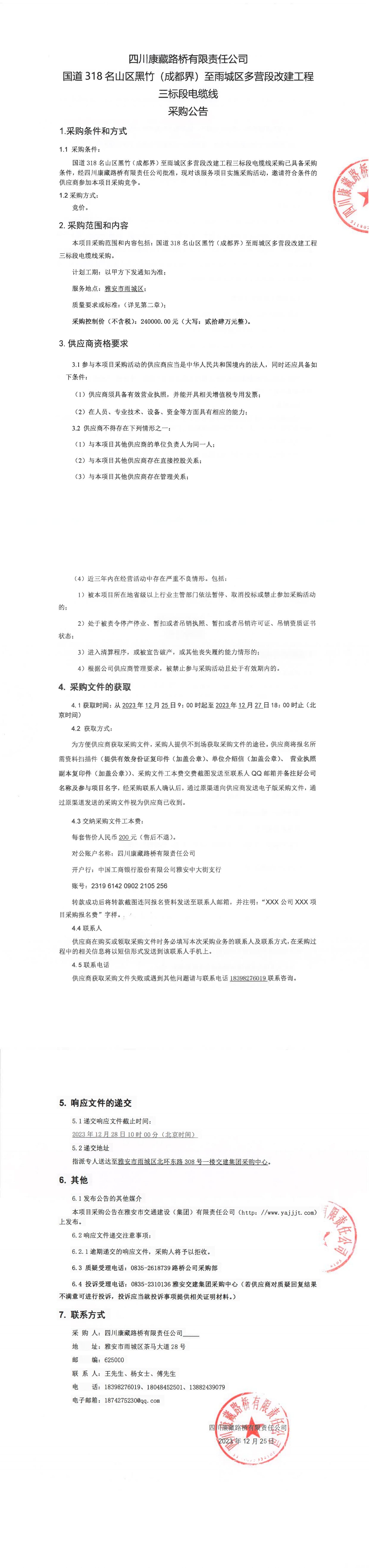 四川康藏路桥有限责任公司国道318名山区黑竹(成都界)至雨城区多营段改建工程三标段电缆线采购公告