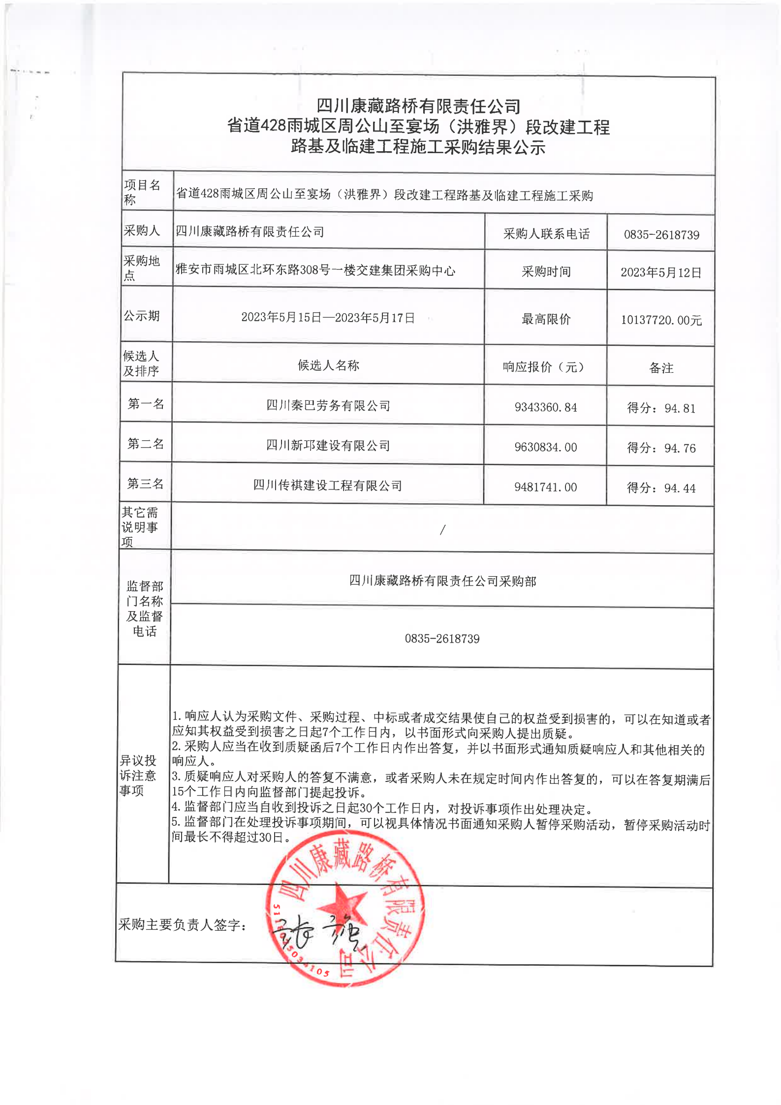 四川康藏路桥有限责任公司省道428雨城区周公山至宴场(洪雅界)段改建工程路基及临建工程施工采购结果公示