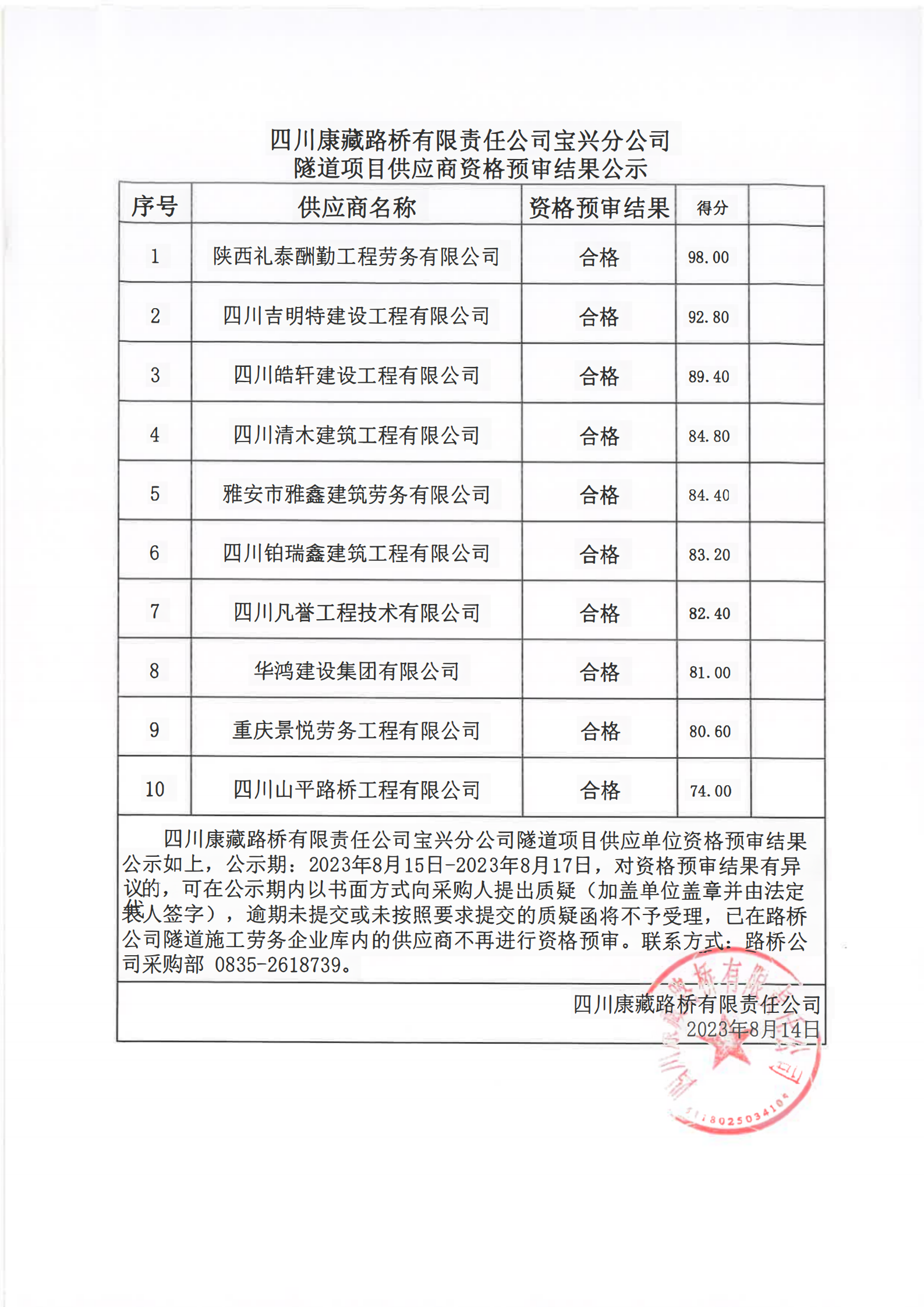 四川康藏路桥有限责任公司宝兴分公司隧道项目供应商资格预审结果公示