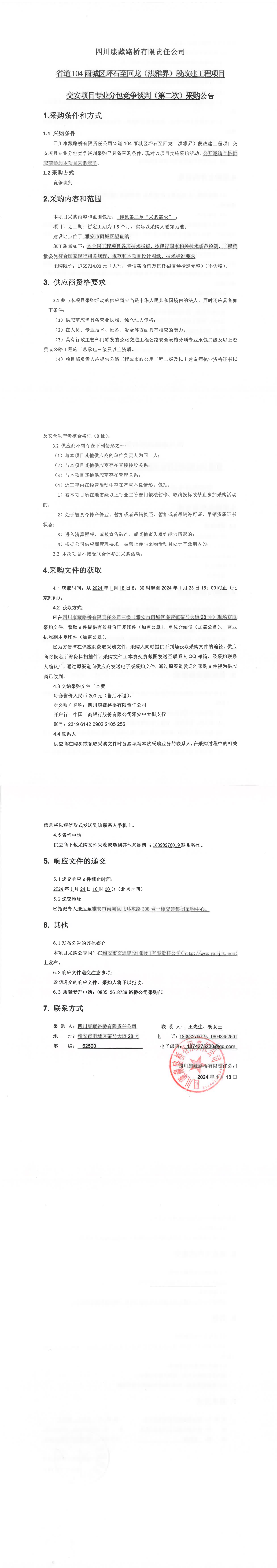 四川康藏路桥有限责任公司省道104雨城区坪石至回龙(洪雅界)段改建工程项目交安项目专业分包竞争谈判(第二次)采购公告