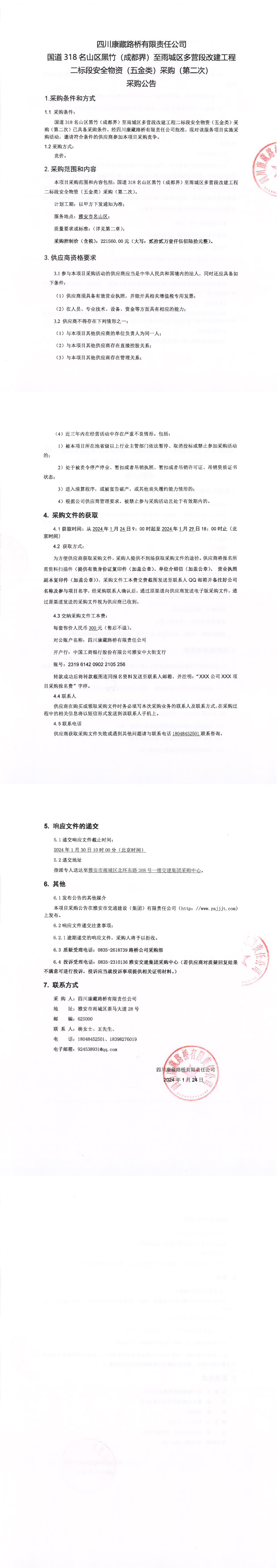 四川康藏路桥有限责任公司国道318名山区黑竹(成都界)至雨城区多营段改建工程二标段安全物资(五金类)采购(第二次)采购公告