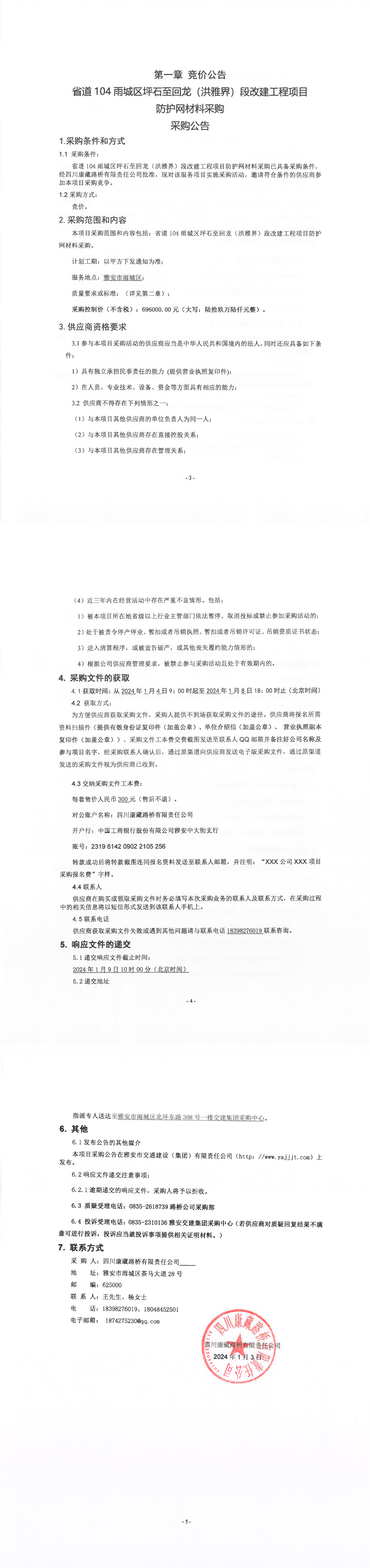 四川康藏路桥有限责任公司省道104雨城区坪石至回龙(洪雅界)段改建工程项目防护网材料采购公告