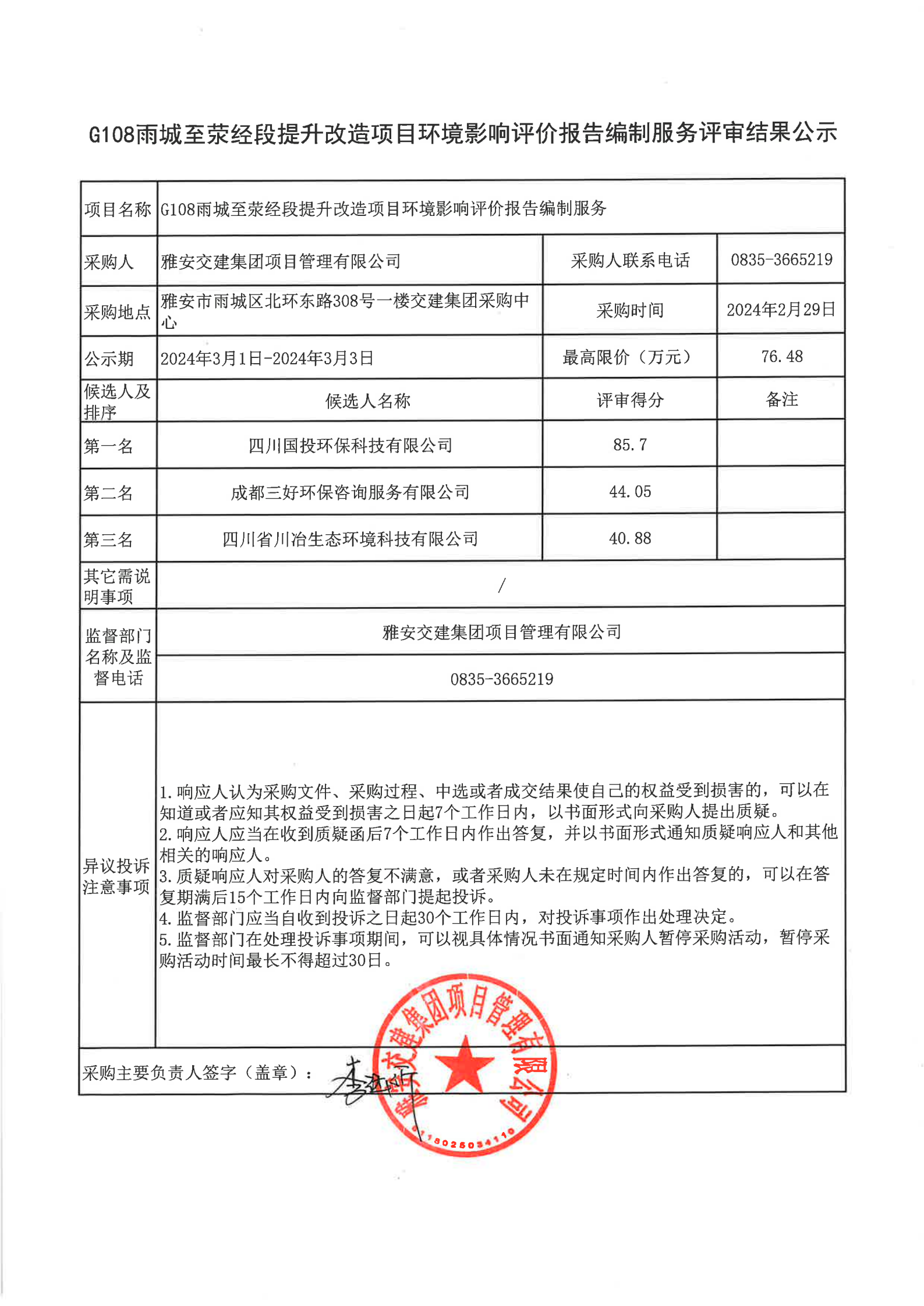 大红鹰dhy(中国)集团项目管理有限公司G108雨城至荥经段提升改造项目环境影响评价报告编制服务评审结果公示