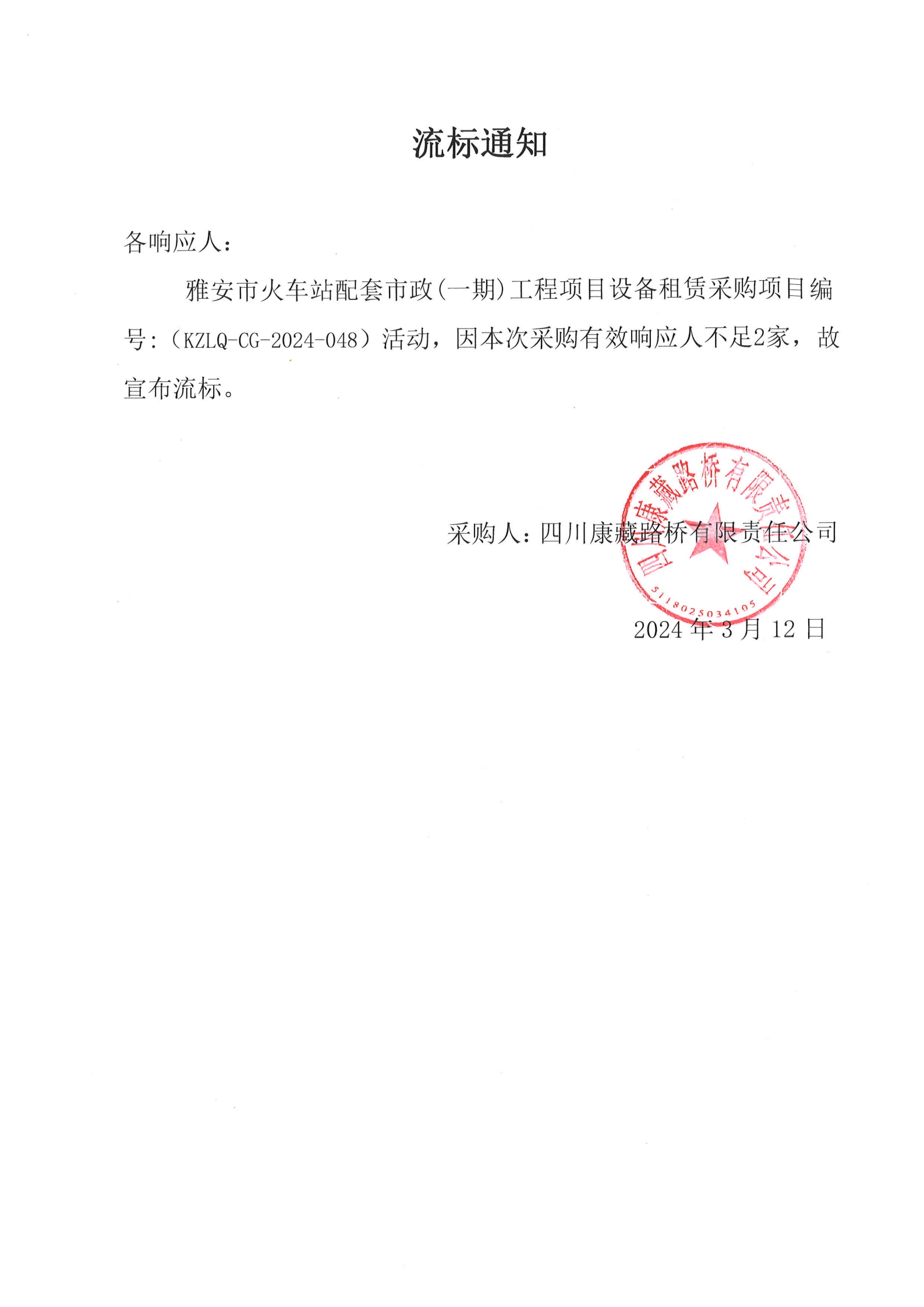 四川康藏路桥有限责任公司雅安市火车站配套市政(一期)工程项目设备租赁采购流标通知