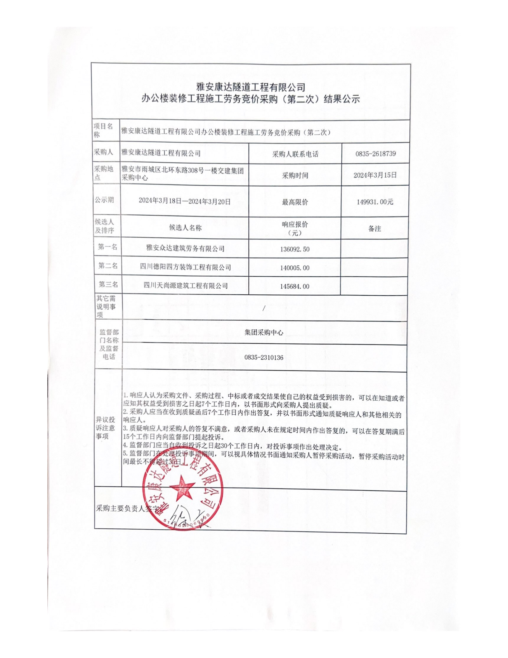 雅安康达隧道工程有限公司办公楼装修工程施工劳务竞价采购(第二次)结果公示
