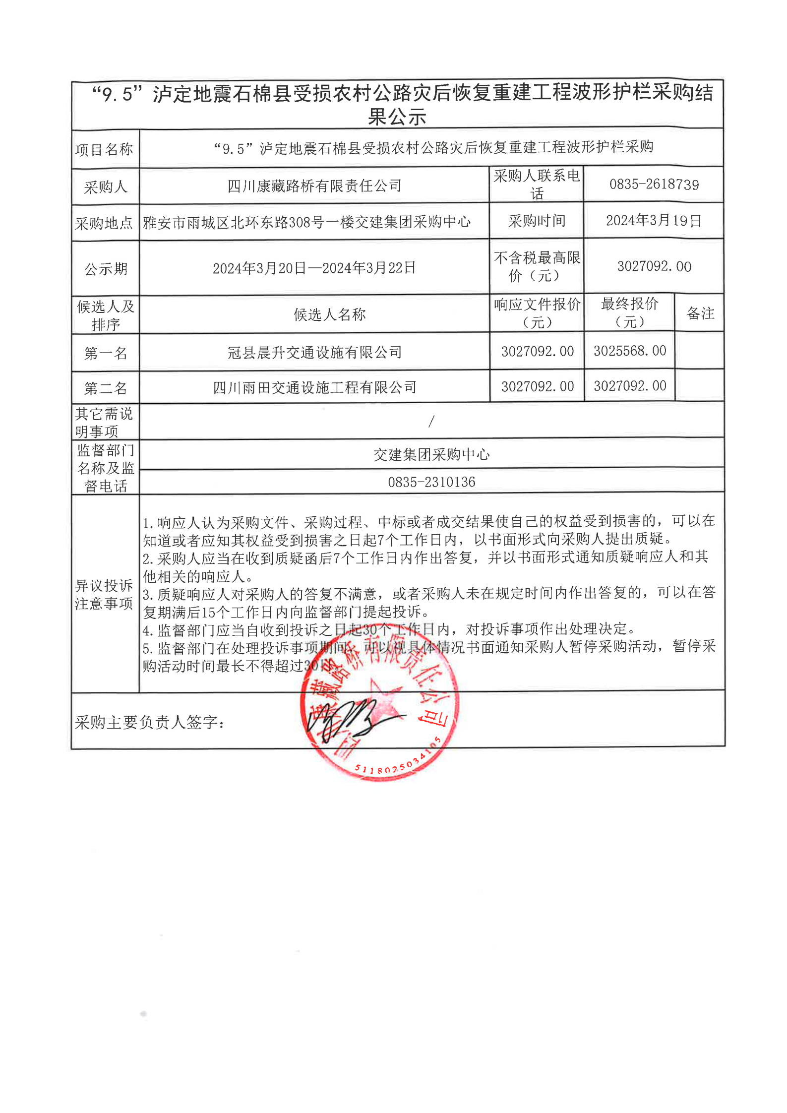 四川康藏路桥有限责任公司“9.5”泸定地震石棉县受损农村公路灾后恢复重建工程波形护栏采购结果公示