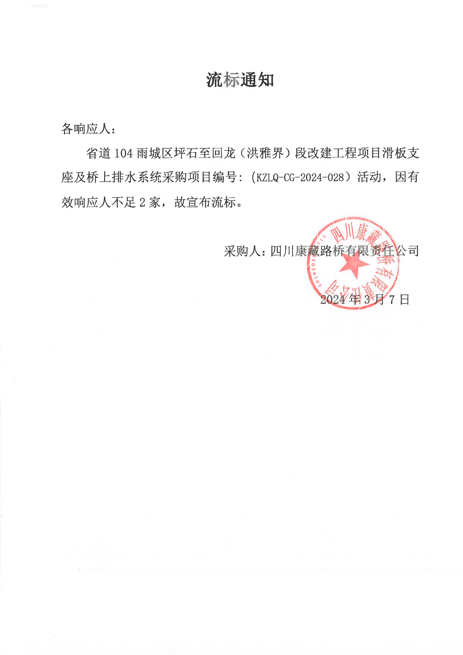 四川康藏路桥有限责任公司省道104雨城区坪石至回龙(洪雅界)段改建工程项目滑板支座及桥上排水系统流采购标通知