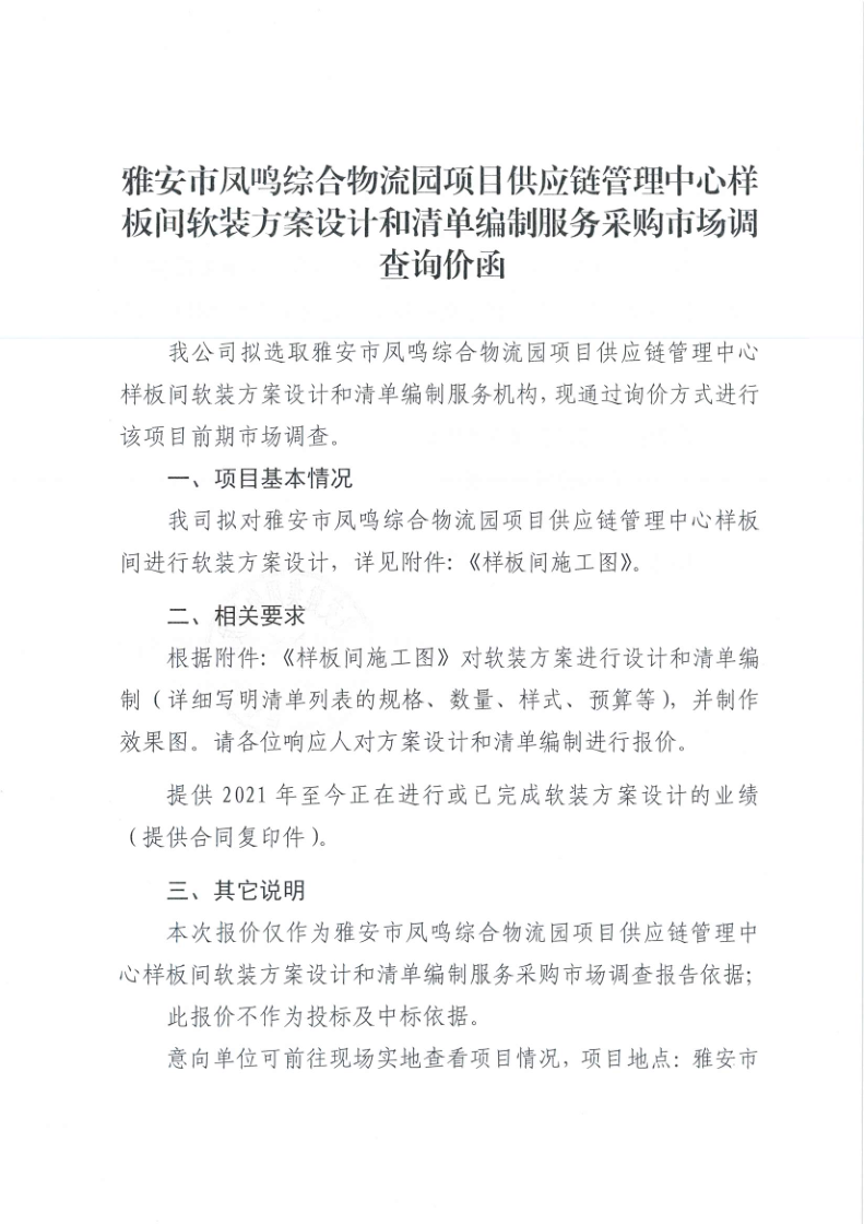 大红鹰dhy(中国)集团物流开展有限公司雅安市凤鸣综合物流园项目供应链管理中心样板间软装方案设计和清单编制服务采购市场调查询价函