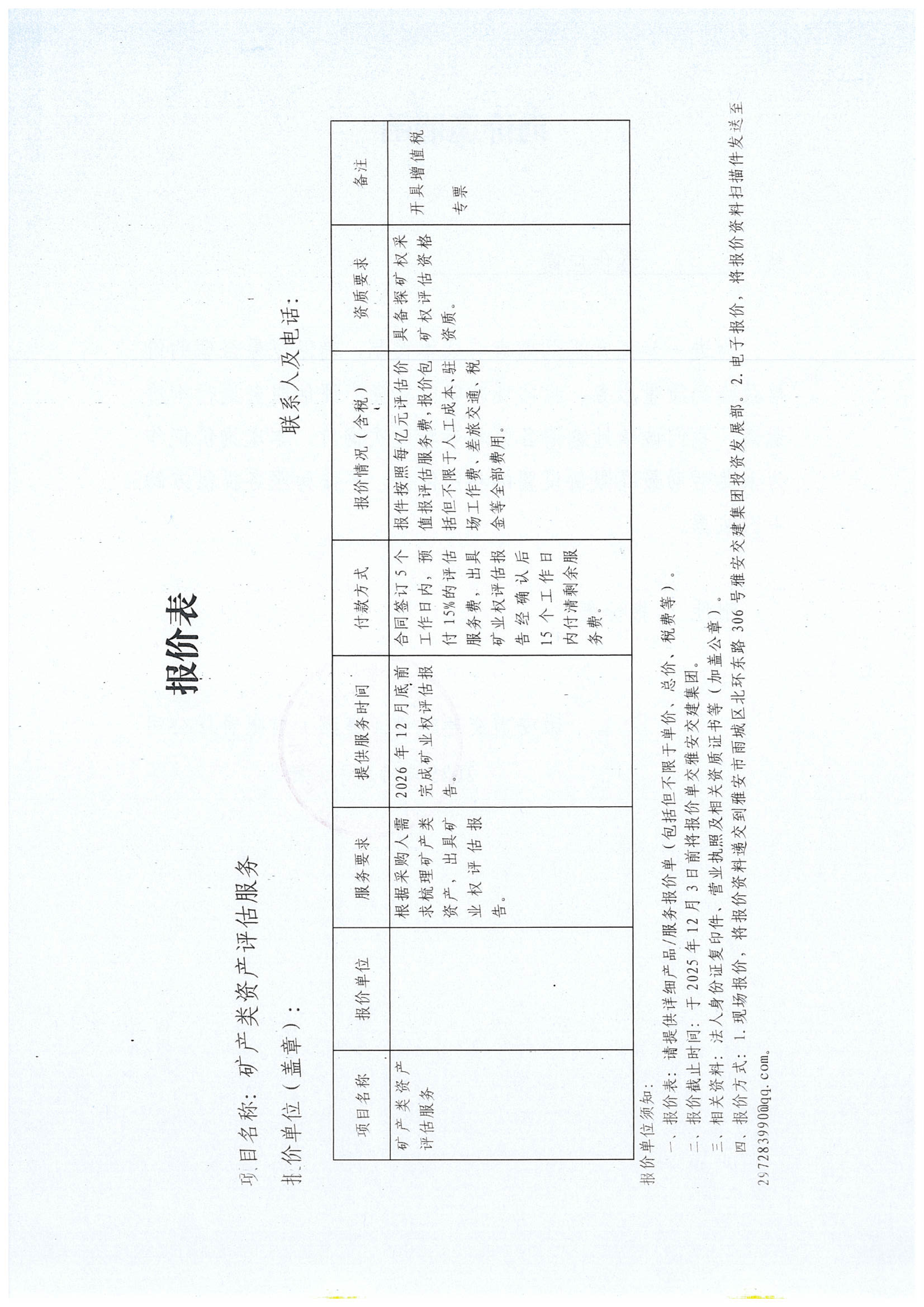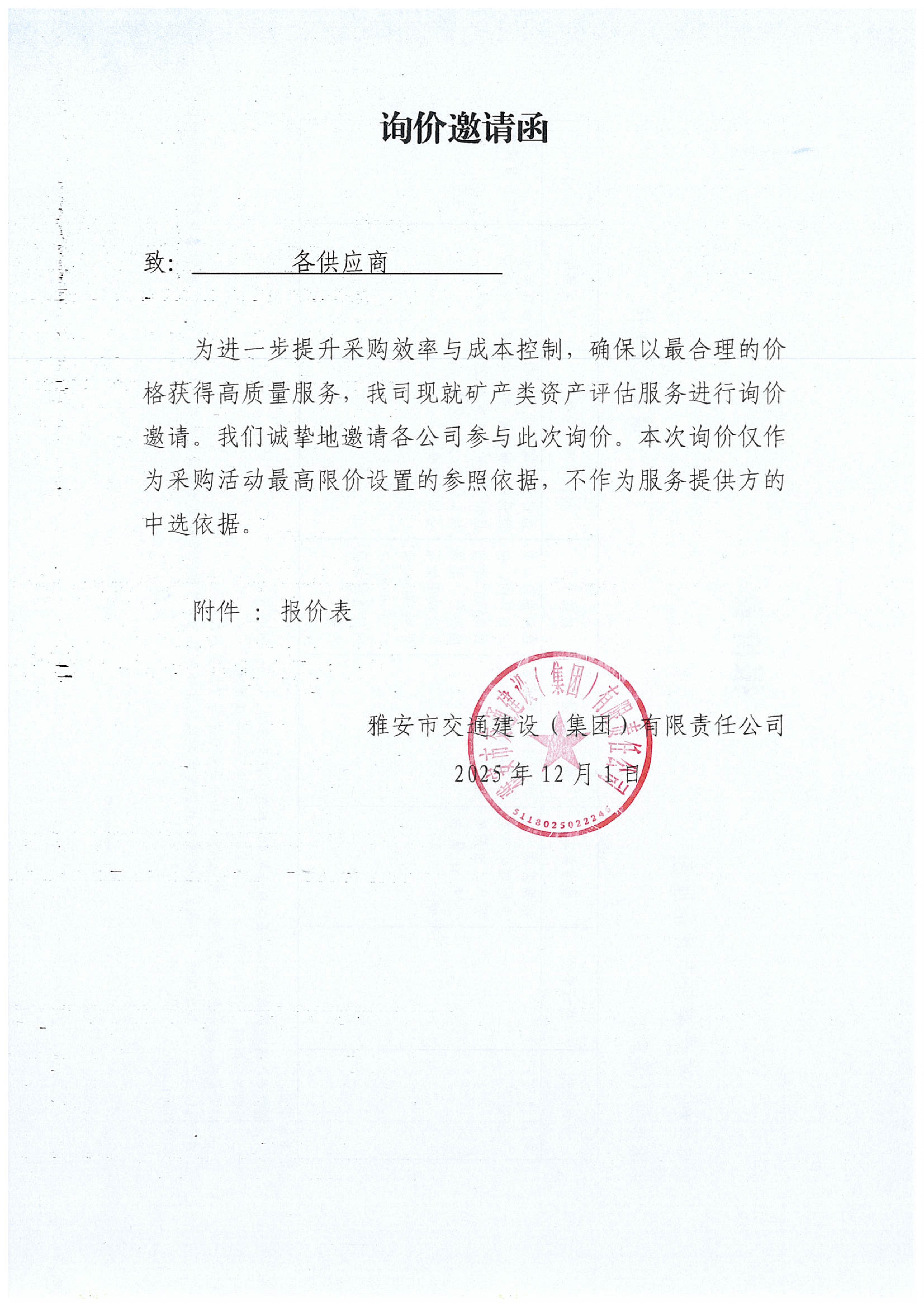 关于雅安市交通建设(集团)有限责任公司矿产类资产评估服务采购限价的询价函