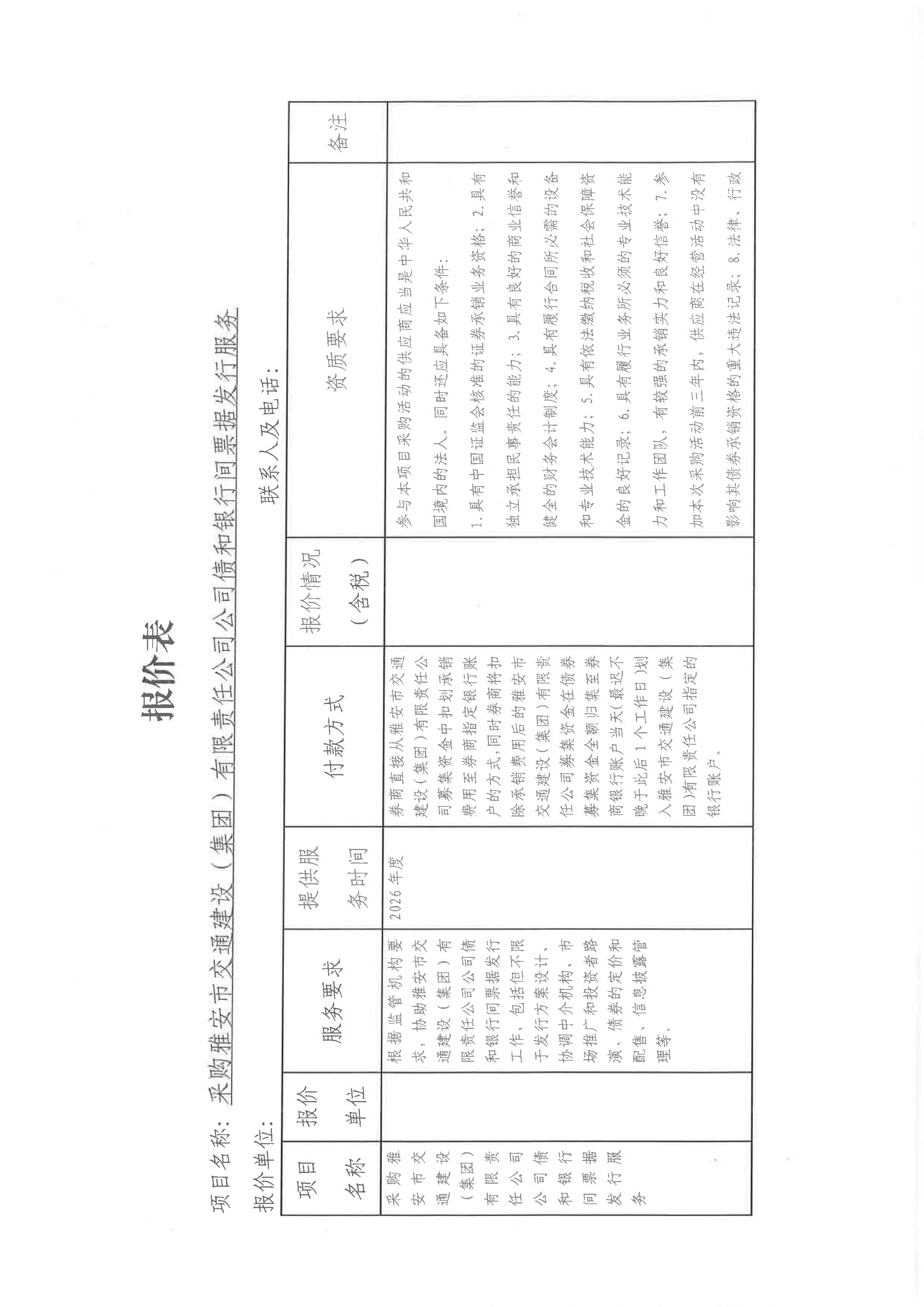 关于采购雅安市交通建设(集团)有限责任公司发行公司债和发行银行间票据所需券商服务限价的询价函