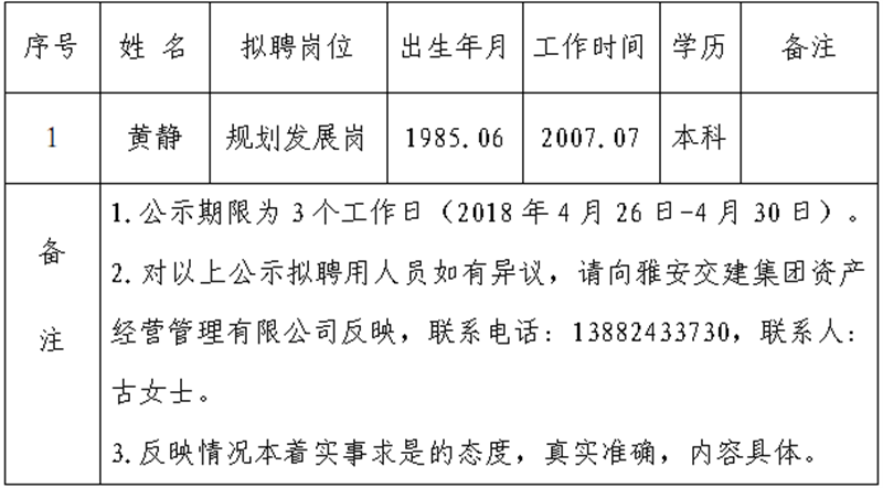 1名拟聘用人员,现公示名单如下: