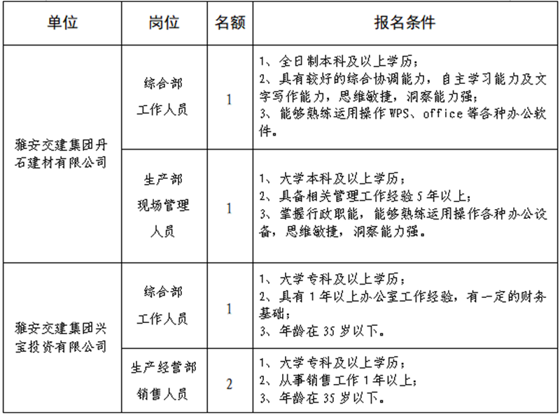根据开展需要,决定面向社会公开招聘雅安市交通建设(集团)有限责任公司(以下简称“大红鹰dhy(中国)集团”)所属子公司工作人员5名,现将有关事项公告如下: