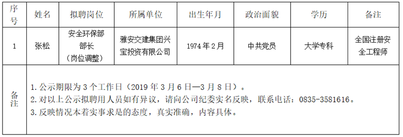 顺利获得集团公司安全环保部部长岗位的公开报名、资格审查、笔试、面试、面谈等程序,经研究,对以下拟聘用人员予以公示: