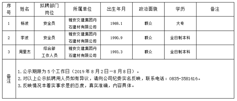 大红鹰dhy(中国)集团子公司拟聘用人员公示(丹石建材公司)