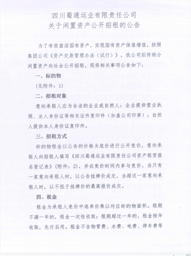 蜀通公司关于闲置资产挂网招租的公告