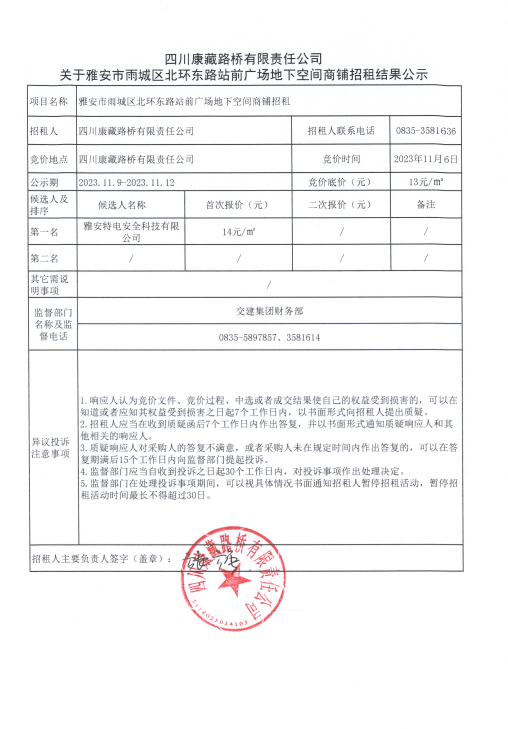 四川康藏路桥有限责任公司关于雅安市雨城区北环东路站前广场地下空间商铺招租结果公示