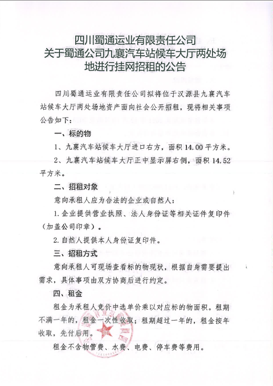 四川蜀通运业有限责任公司关于蜀通公司九襄汽车站候车大厅两处场地进行挂网招租的公告
